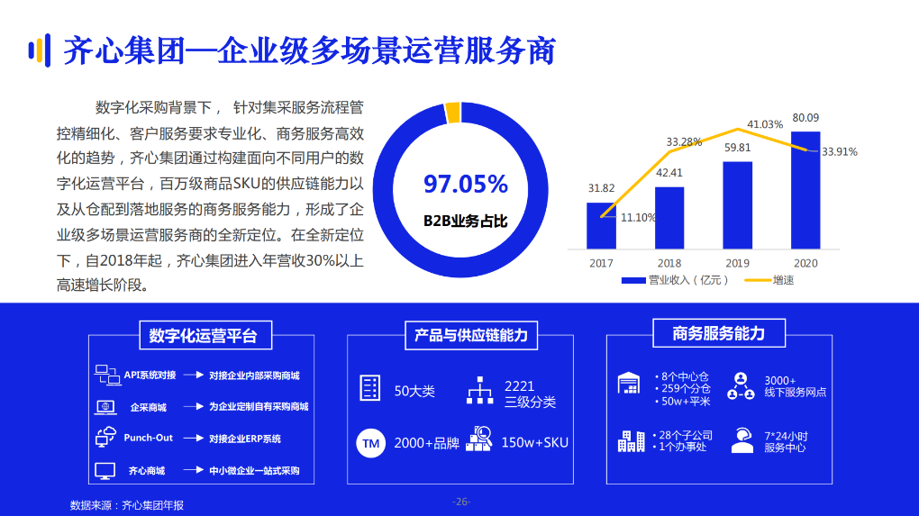 “十四五”規(guī)劃提出了“加快數(shù)字化發(fā)展,建設(shè)數(shù)字中國(guó)”的發(fā)展目標(biāo),如今電商化、云端化、智慧化、大數(shù)據(jù)化已成為中國(guó)企業(yè)數(shù)字化采購(gòu)的變革方向。企業(yè)采購(gòu)數(shù)字化轉(zhuǎn)型離不開(kāi)外部平臺(tái)的協(xié)助,面對(duì)企業(yè)更多場(chǎng)景、更個(gè)性化、更深層次的采購(gòu)服務(wù)需求,采購(gòu)平臺(tái)提供一體化、定制化企業(yè)采購(gòu)解決方案的趨勢(shì)逐步加深,如齊心集團(tuán)等具備綜合服務(wù)能力的服務(wù)商將迎來(lái)重要的發(fā)展機(jī)遇。隨著采購(gòu)服務(wù)商對(duì)企業(yè)需求場(chǎng)景的不斷開(kāi)發(fā),數(shù)字化采購(gòu)將會(huì)刺激企業(yè)“消費(fèi)”擴(kuò)容,這對(duì)當(dāng)前社會(huì)及國(guó)民經(jīng)濟(jì)增長(zhǎng)有極大的推動(dòng)作用。