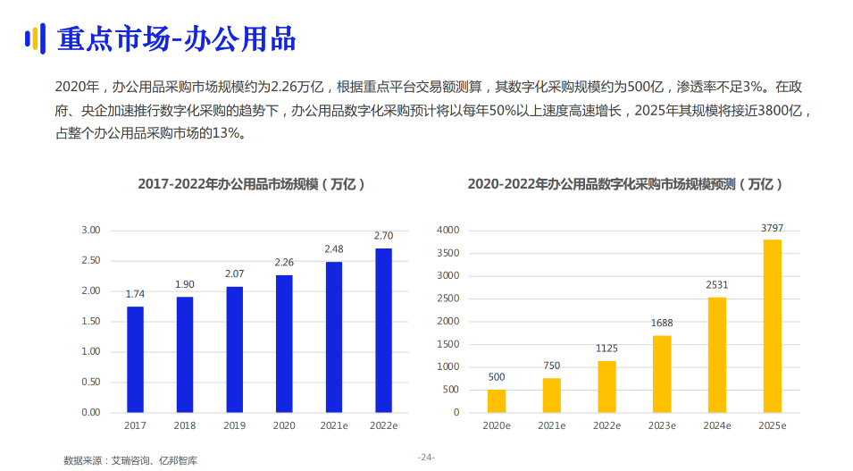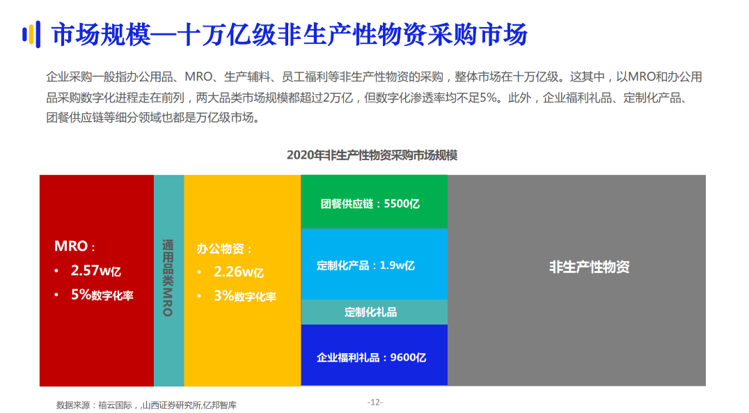 5月26日,專注于電子商務(wù)產(chǎn)業(yè)研究的億邦智庫(kù)正式發(fā)布了《2021中國(guó)數(shù)字化采購(gòu)發(fā)展報(bào)告》(以下簡(jiǎn)稱“報(bào)告”)。報(bào)告顯示,2021年數(shù)字化采購(gòu)市場(chǎng)正式進(jìn)入成長(zhǎng)期,其中以MRO工業(yè)品和辦公用品采購(gòu)數(shù)字化進(jìn)程走在前列,兩大品類市場(chǎng)規(guī)模都超過(guò)2萬(wàn)億。報(bào)告預(yù)測(cè),在十萬(wàn)億級(jí)、數(shù)字化滲透率不足5%的采購(gòu)市場(chǎng)內(nèi),將有希望誕生一批營(yíng)收過(guò)千億、市值過(guò)千億的雙千億平臺(tái)。