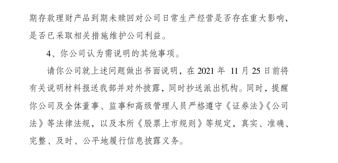 同時(shí),深交所要求公司年審會(huì)計(jì)師結(jié)合公司2020年底銀行存款詢證函回函情況,補(bǔ)充說(shuō)明相關(guān)審計(jì)程序是否充分,所獲審計(jì)證據(jù)是否準(zhǔn)確,公司2020年年報(bào)關(guān)于銀行存款質(zhì)押狀態(tài)的披露是否存在真實(shí)準(zhǔn)確。并結(jié)合公司2021年三季度末貨幣資金余額,補(bǔ)充說(shuō)明到期未贖回期存款理財(cái)產(chǎn)品對(duì)公司日常生產(chǎn)經(jīng)營(yíng)是否存在重大影響,是否已采取相關(guān)措施維護(hù)公司利益。