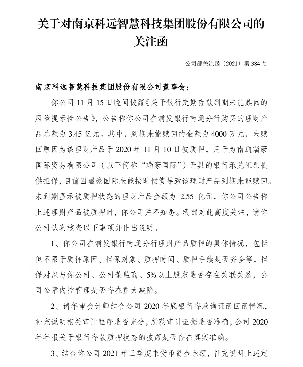 科遠(yuǎn)智慧3億元存款遭質(zhì)押擔(dān)保一事持續(xù)引發(fā)市場(chǎng)關(guān)注,11月17日,深交所向公司下發(fā)關(guān)注函,要求公司認(rèn)真核查并說(shuō)明在浦發(fā)銀行南通分行理財(cái)產(chǎn)品質(zhì)押的具體情況。