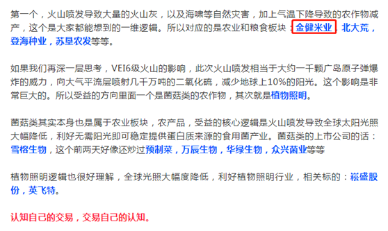 在這一舉動(dòng)的背后,還有游資精心布局,一部分A股標(biāo)的物被整理出來(lái),貼上“火山利好”概念,概念炒作、操縱股價(jià)、高位派發(fā)的“擊鼓傳花”游戲已是蓄勢(shì)待發(fā)。主業(yè)是糧油深加工的金健米業(yè)也被自媒體標(biāo)上“火山利好”概念。