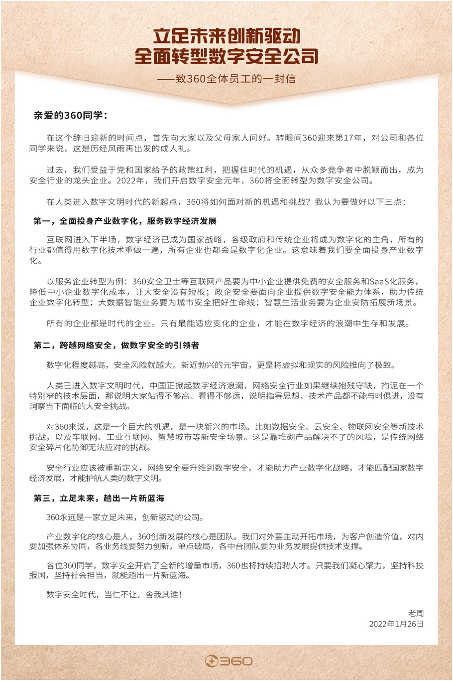 1月26日,360集團(tuán)創(chuàng)始人周鴻祎發(fā)出內(nèi)部全員信,宣布360全面轉(zhuǎn)型數(shù)字安全公司。2022年數(shù)字安全元年到來,同時開啟了全新增量市場,周鴻祎稱360將持續(xù)招聘人才。