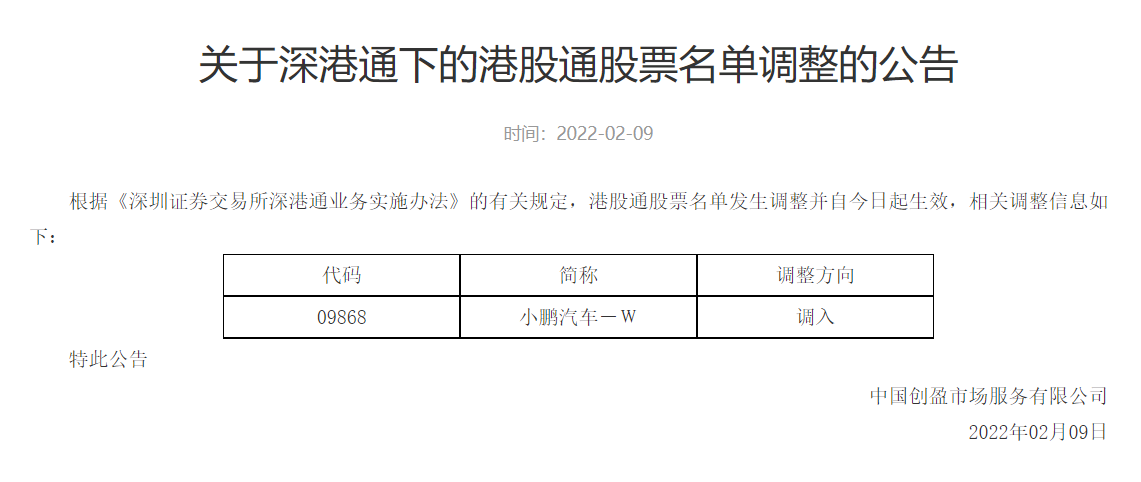 2月9日,深交所發(fā)布公告稱,根據(jù)《深圳證券交易所深港通業(yè)務實施辦法》的有關規(guī)定,將小鵬汽車(9868.HK)納入深港通下的港股通股票名單,自2月9日起正式生效。受此利好消息提振,9日收盤,小鵬汽車報收152.50港元,漲幅達8%。2月10日,小鵬汽車繼續(xù)上漲3.08%,最新市值2692億港元。
