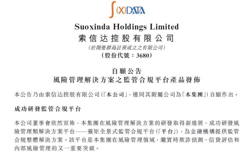 2月25日下午,索信達(dá)控股有限公司(下稱:索信達(dá))發(fā)布公告稱,在風(fēng)險(xiǎn)管理解決研發(fā)方面取得新進(jìn)展,成功研發(fā)風(fēng)險(xiǎn)管理類平臺(tái)——靈矩全景式監(jiān)管合規(guī)平臺(tái),為金融機(jī)構(gòu)提供監(jiān)管合規(guī)整體解決方案。公告稱,該平臺(tái)是公司在風(fēng)險(xiǎn)管理領(lǐng)域的又一突破。