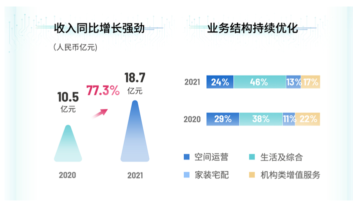 雅生活一直聚焦社區(qū)生活服務(wù),大力發(fā)展市場化業(yè)務(wù),并通過資本驅(qū)動、自營孵化、合作試點(diǎn)、跨界合作等方式,不斷突破業(yè)務(wù)邊界,打造雅生活收入增長第二曲線。年內(nèi),集團(tuán)業(yè)主增值服務(wù)收入達(dá)18.67億元,同比大幅增長77.3%,占總收入約13.2%,相比2020年占比提升了2.7%。