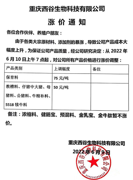 部分飼料企業(yè)調(diào)價(jià)函(供圖:西谷生物)