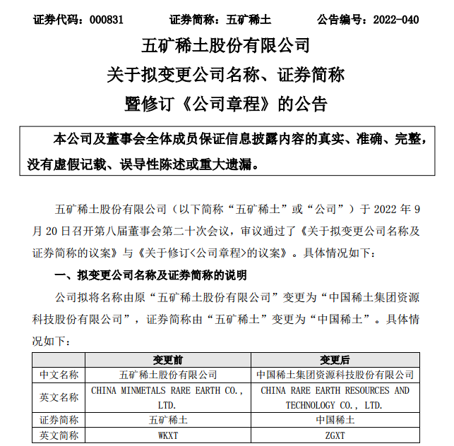 中國稀土集團資源科技股份有限公司其實是由五礦稀土更名而來。9月20日晚間,五礦稀土發(fā)布公告稱,公司擬將名稱由原“五礦稀土股份有限公司”變更為“中國稀土集團資源科技股份有限公司”,證券簡稱由“五礦稀土”變更為“中國稀土”。