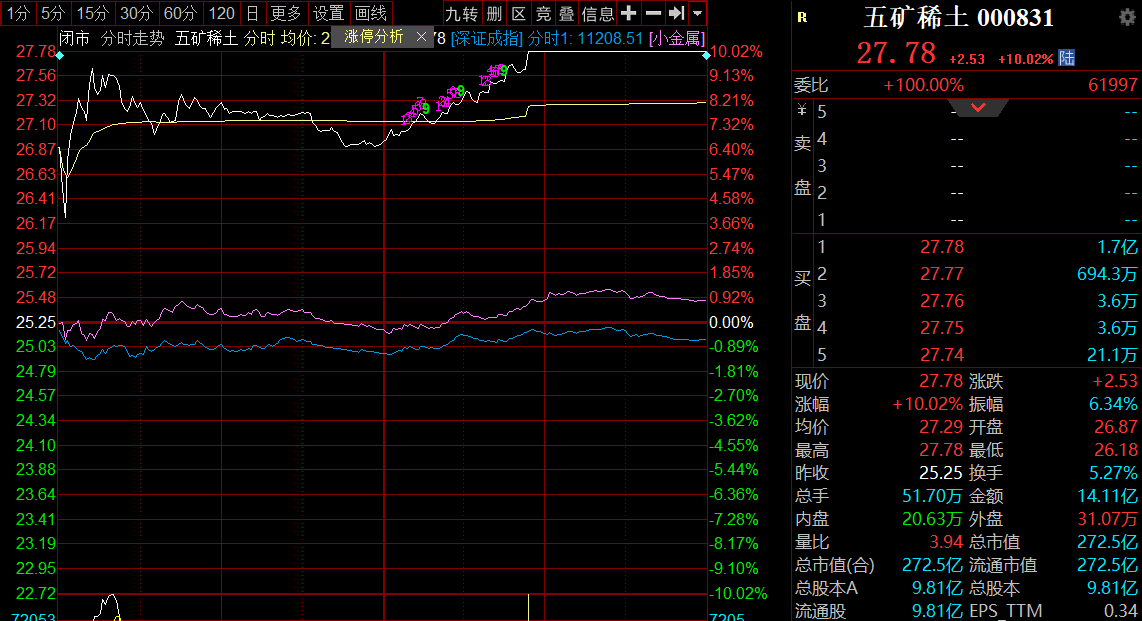 受此消息影響,9月21日早盤,五礦稀土開盤大漲,當日以漲停收盤,報27.78元/股。