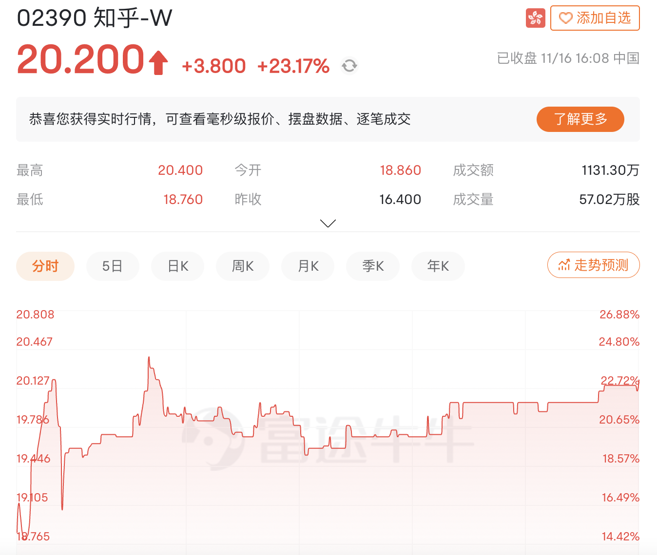 11月16日消息,知乎在美股和港股市場均迎來大漲。北京時間2022年11月15日,知乎美股盤中大漲逾33%,最終收盤1.27美元,漲幅24.51%。北京時間2022年11月16日,知乎港股延續(xù)了上漲趨勢,盤中最大漲幅達(dá)到24.39%,收盤報20.2港元,最終上漲達(dá)到23.17%。