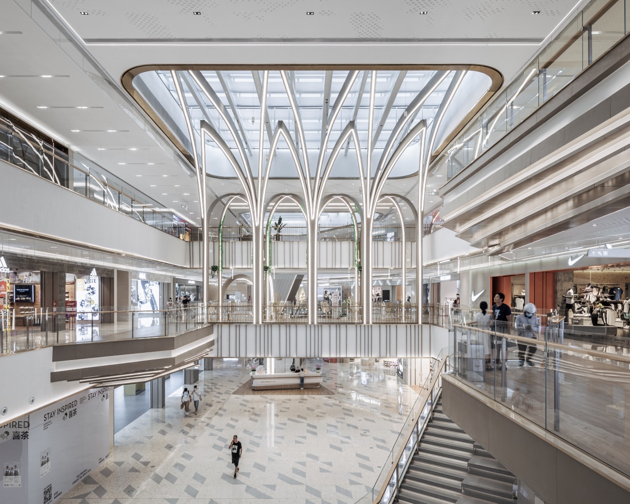 廈門集美世茂廣場(chǎng)中庭大面積天窗,保證室內(nèi)充足光線;同時(shí)通過(guò)設(shè)置內(nèi)遮陽(yáng)及彩釉點(diǎn),又有效保證了中庭溫度適宜,極大地減少了商場(chǎng)的能耗,注入環(huán)保設(shè)計(jì)理念。