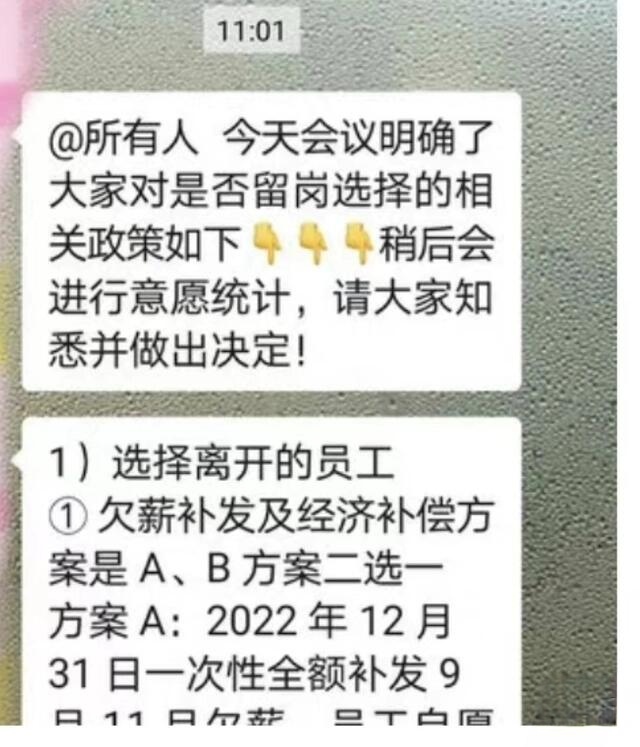 針對(duì)解決欠薪問(wèn)題的進(jìn)展,一位國(guó)美中層人士向《證券日?qǐng)?bào)》記者透露,公司內(nèi)部通知,給出了三個(gè)選擇,對(duì)于選擇離開(kāi)員工而言,其有A、B兩個(gè)方案可以選擇:一是選擇離開(kāi),2022年12月31日一次性全額補(bǔ)發(fā)9月份至11月份欠薪,員工自愿放棄本次經(jīng)濟(jì)補(bǔ)償;二是等待賠償,2023年3月31日,國(guó)美將補(bǔ)發(fā)欠薪并支付全數(shù)補(bǔ)償。對(duì)于繼續(xù)留職員工,員工需同意與新公司主體重新簽訂勞動(dòng)合同,2022年12月31日一次性全額補(bǔ)發(fā)9月份至11月份欠薪,員工自愿放棄對(duì)本次經(jīng)濟(jì)補(bǔ)償金的追討,并自12月份起執(zhí)行新的薪酬績(jī)效方案。