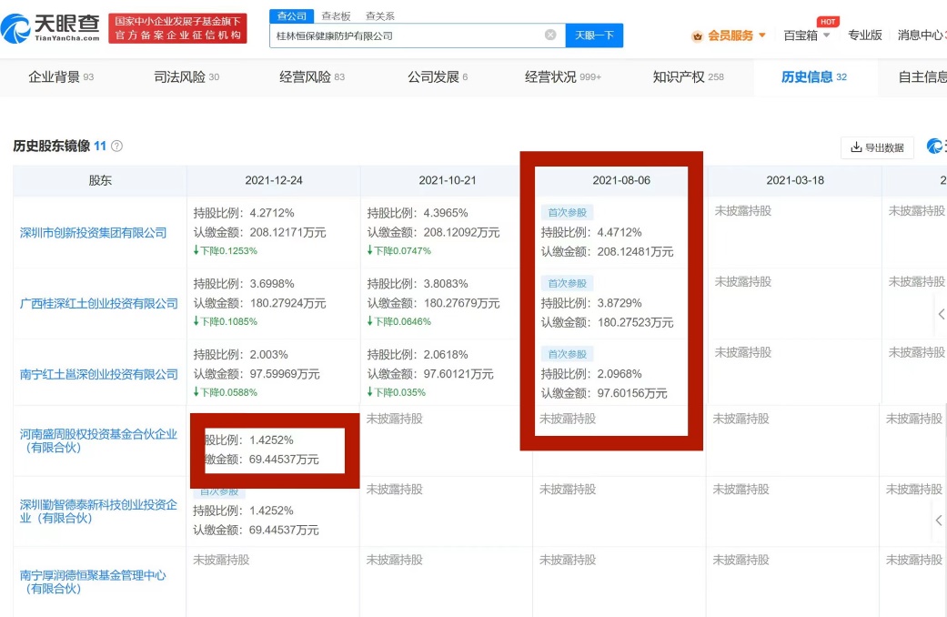 根據(jù)天眼查APP顯示,深圳市創(chuàng)新投資集團有限公司、廣西桂深紅土創(chuàng)業(yè)投資有限公司、南寧紅土邕深創(chuàng)業(yè)投資有限公司首次參股時間為2021年8月6日,河南盛周股權投資基金合伙企業(yè)(有限合伙)首次參股時間為2021年12月24號。本次交易后上述公司將不再持有恒保健康股權。