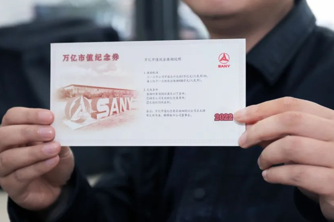 4月3日,三一集團(tuán)官方微信公眾號宣布,575張制作精美的“萬億市值紀(jì)念券”經(jīng)三一集團(tuán)人力資源總部統(tǒng)一發(fā)放到三一集團(tuán)各關(guān)鍵員工手中。未來當(dāng)三一集團(tuán)旗下上市公司總市值超過1萬億元時,這張獎券可兌換100萬元獎金。