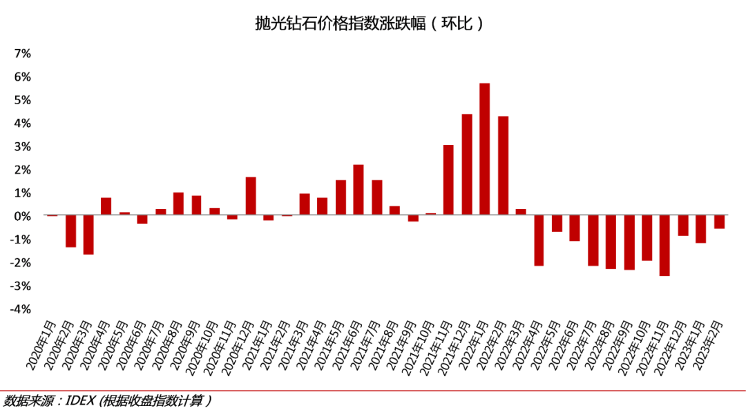 近期國(guó)際鉆石價(jià)格一路下滑的趨勢(shì)或許是答案。據(jù)我愛鉆石網(wǎng)發(fā)布統(tǒng)計(jì)數(shù)據(jù),國(guó)際IDEX成品鉆價(jià)格指數(shù)自2022年3月開始從高點(diǎn)一路下跌,2022年11月開始出現(xiàn)同比負(fù)增長(zhǎng),2023年春節(jié)月更是同比降幅近15%。截至2023年2月,該指數(shù)累計(jì)環(huán)比下跌11個(gè)月,且下跌幅度逐步加深。