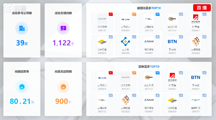 據(jù)線上數(shù)據(jù)統(tǒng)計(jì),截至5月11日上午12點(diǎn),投資者在本次活動共提問1122個,上市公司問題總回復(fù)數(shù)量為900個,問題回復(fù)率達(dá)到80.21%。其中,穩(wěn)定股價(jià)、提升盈利能力等市值管理相關(guān)問題成為投資者提問較多的領(lǐng)域。