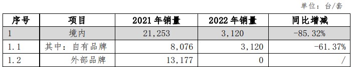 2022年,海馬汽車境內(nèi)銷量為3120臺,相比較2021年境內(nèi)21253臺的銷量,同比減少85.32%。公司稱,這是因為2021年末,公司終止了與小鵬汽車的合作生產(chǎn)業(yè)務(wù),產(chǎn)品結(jié)構(gòu)由2021年產(chǎn)銷量近半數(shù)為合作生產(chǎn)的外部品牌產(chǎn)品,轉(zhuǎn)變?yōu)?022年產(chǎn)銷量全部為自有品牌產(chǎn)品。