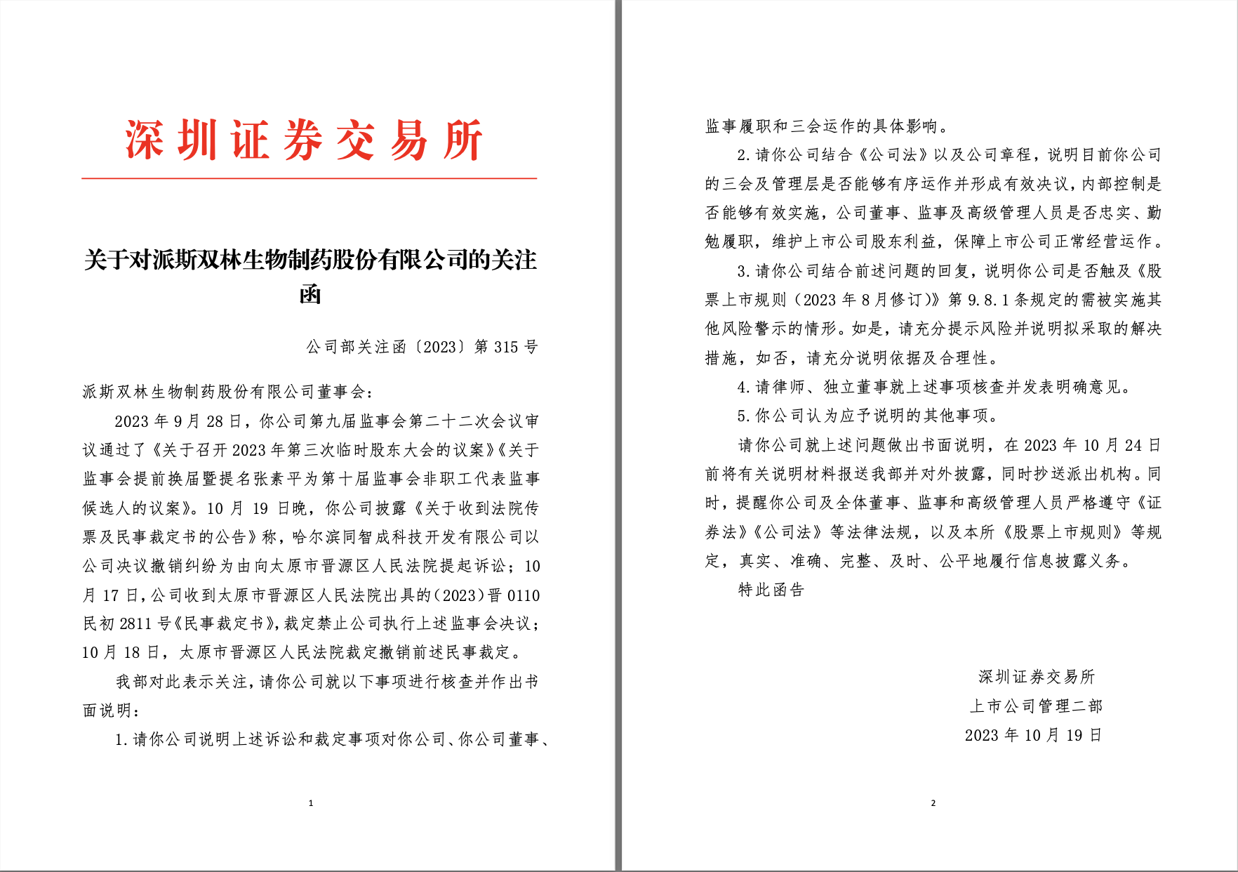 就在派林生物發(fā)布收到法院傳票及民事裁定書的公告當(dāng)晚,深交所火速向派林生物發(fā)布關(guān)注函,要求公司說明三會(huì)及管理層是否能夠有序運(yùn)作并形成有效決議,內(nèi)部控制是否能夠有效實(shí)施,公司董事、監(jiān)事及高級(jí)管理人員是否忠實(shí)、勤勉履職,維護(hù)上市公司股東利益,保障上市公司正常經(jīng)營(yíng)運(yùn)作;同時(shí)還要求公司說明是否觸及相關(guān)規(guī)定的需被實(shí)施其他風(fēng)險(xiǎn)警示的情形。