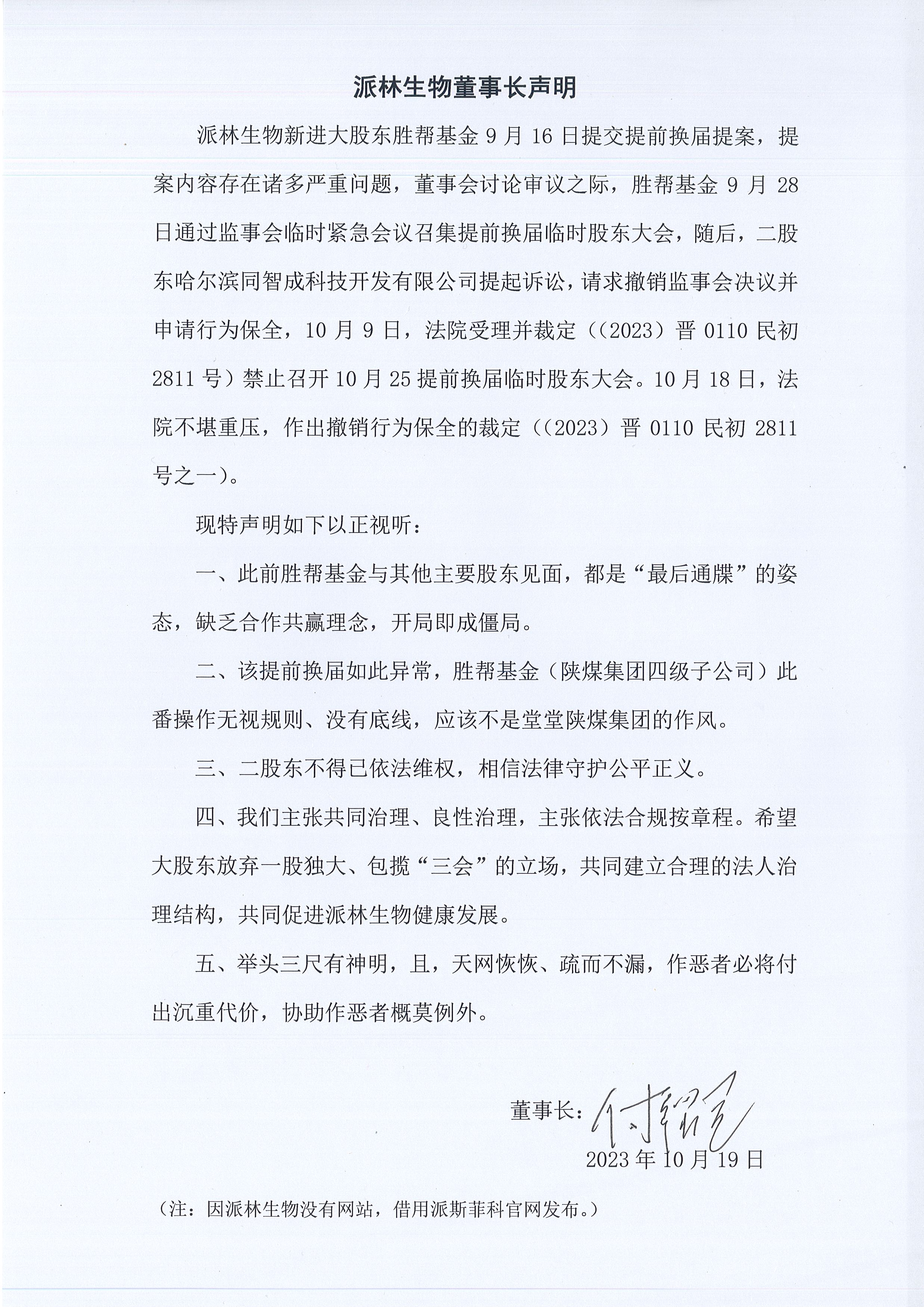 付紹蘭在聲明中表示,一、此前勝幫基金與其他主要股東見面,都是“最后通牒”的姿態(tài),缺乏合作共贏理念,開局即成僵局;二、該提前換屆如此異常,勝幫基金(陜煤集團(tuán)四級(jí)子公司)此番操作無(wú)視規(guī)則、沒有底線,應(yīng)該不是堂堂陜煤集團(tuán)的作風(fēng);三、二股東不得已依法維權(quán),相信法律守護(hù)公平正義;四、我們主張共同治理、良性治理,主張依法合規(guī)按章程。希望大股東放棄一股獨(dú)大、包攬“三會(huì)”的立場(chǎng),共同建立合理的法人治理結(jié)構(gòu),共同促進(jìn)派林生物健康發(fā)展;五、舉頭三尺有神明,且,天網(wǎng)恢恢、疏而不漏,作惡者必將付出沉重代價(jià),協(xié)助作惡者概莫例外。