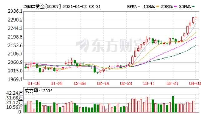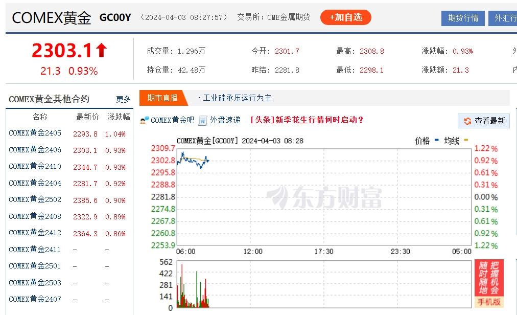 早盤國(guó)際金價(jià)升破2300美元(供圖:東方財(cái)富)