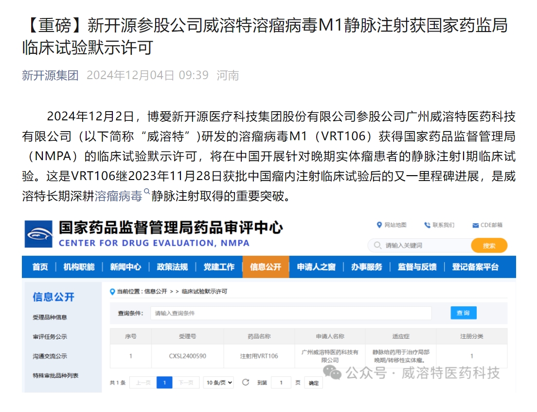 這是VRT106繼2023年11月28日獲批中國(guó)瘤內(nèi)注射臨床試驗(yàn)后的又一里程碑進(jìn)展,是威溶特長(zhǎng)期深耕溶瘤病毒靜脈注射取得的重要突破。