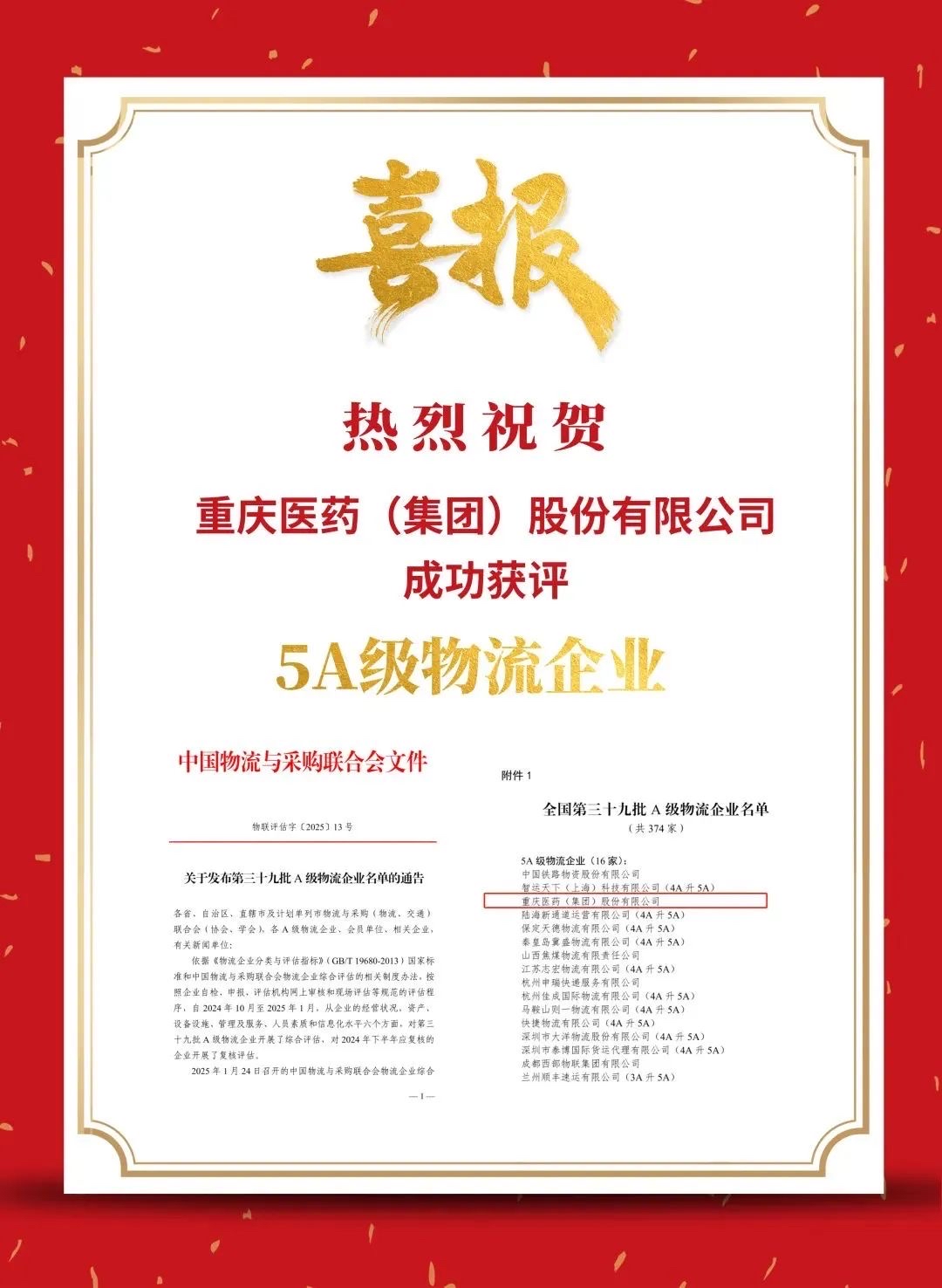 此次發(fā)布的名單上,公司下屬的3家單位也同時上榜,重慶醫(yī)藥集團河南有限公司、重藥控股(湖南)有限公司獲評4A級物流企業(yè),重藥控股(湖南)有限公司全資子公司湖南中邦恒盛醫(yī)藥有限公司通過4A復審。