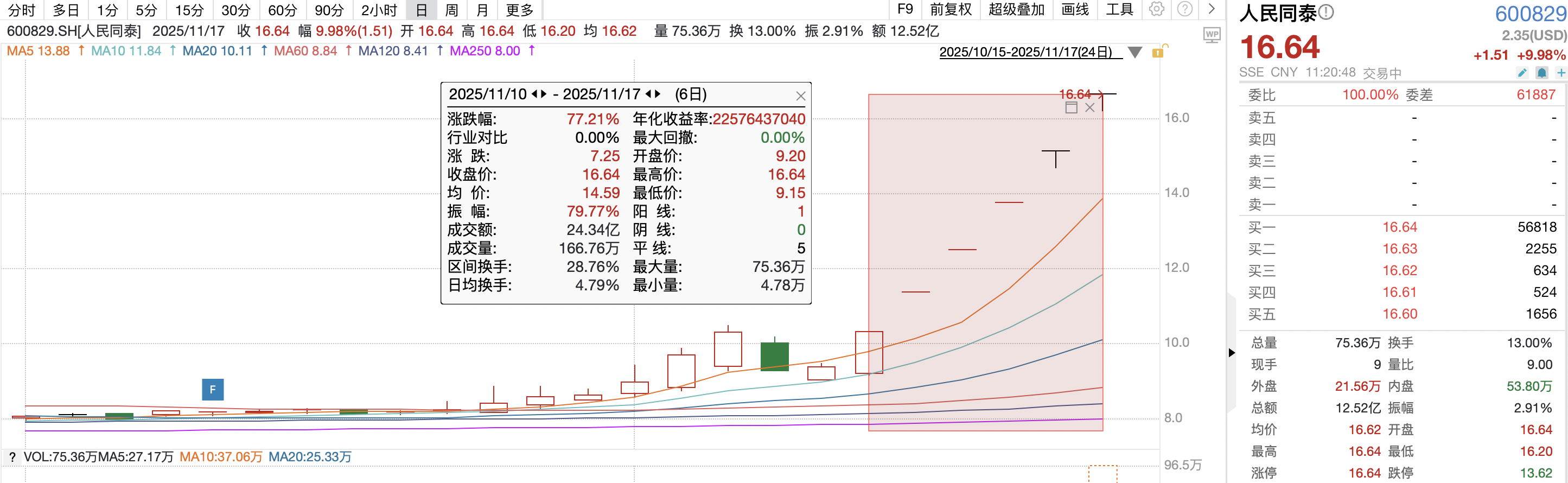 Wind數(shù)據(jù)顯示,截至11月17日午間收盤,人民同泰已連續(xù)6個交易日漲停,公司股價從11月10日的9.20元/股一路飆升至11月17日的16.64元/股,累計(jì)漲幅高達(dá)77.21%,總市值達(dá)到96億元。