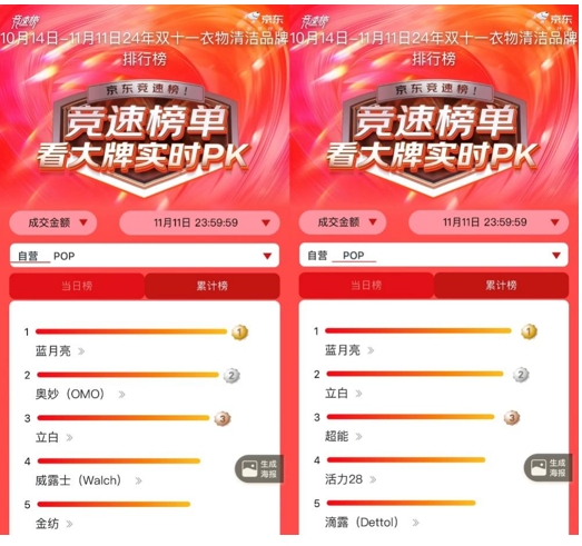 在京東平臺,藍(lán)月亮占據(jù)了11月11日24年雙十一衣物清潔品牌自營、POP當(dāng)日榜的雙料榜首,還是10月14日至11月11日衣物清潔品牌自營、POP累計(jì)榜榜首。