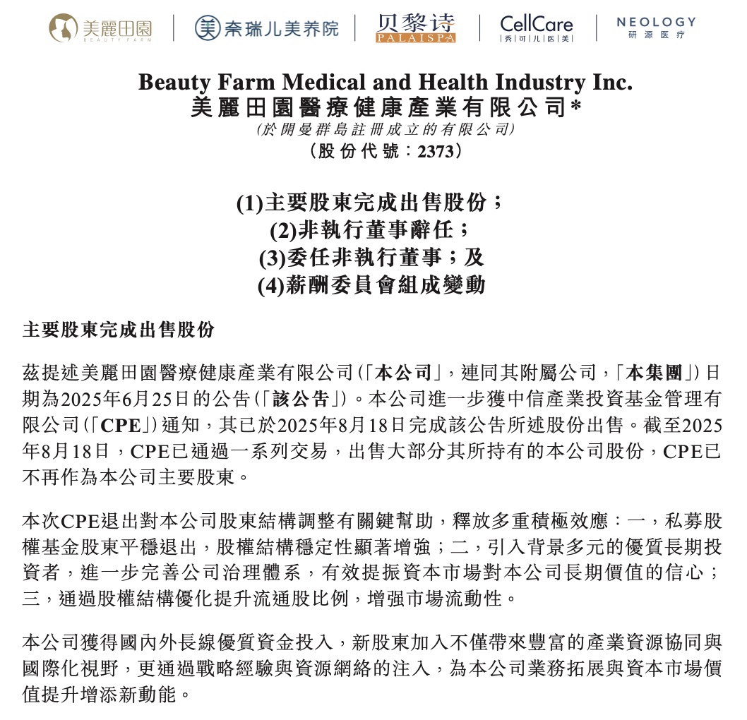 8月18日,美麗田園醫(yī)療健康產(chǎn)業(yè)有限公司(以下簡稱“美麗田園”)宣布,已接獲中信產(chǎn)業(yè)投資基金管理有限公司(以下簡稱“CPE”)通知,截至8月18日,CPE已順利完成5132.9萬股公司股份的出售交割。截至目前,CPE已不再作為公司主要股東。