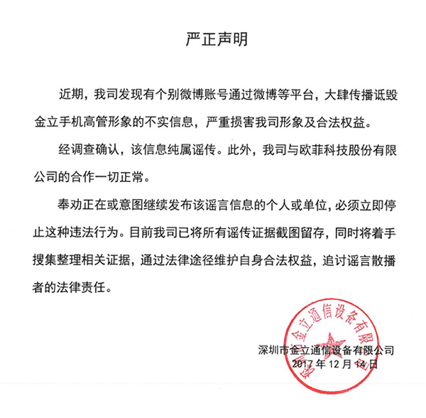 12月14日晚間,金立手機(jī)對近日網(wǎng)絡(luò)上公司高管涉賭傳聞做出否認(rèn)。金立在聲明中稱,“近期,我司發(fā)現(xiàn)有個(gè)別微博賬號通過微博等平臺(tái),大肆傳播詆毀金立手機(jī)高管形象的不實(shí)消息,嚴(yán)重?fù)p害我司形象及合法權(quán)益。”