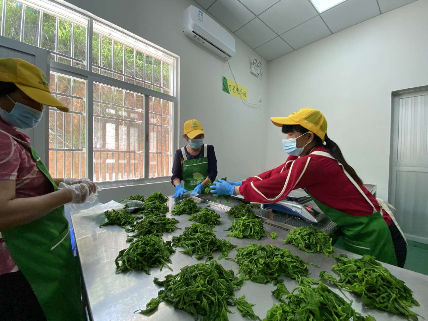 (桑芽菜種植合作社工人們在車間進行分揀包裝)