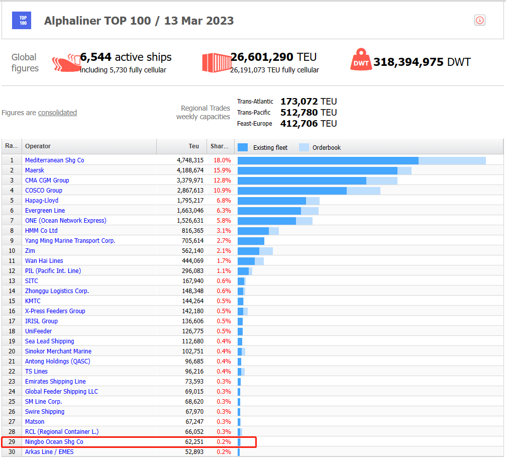 據(jù)國際航運咨詢機構(gòu)Alphaliner最新數(shù)據(jù)顯示,3月份,寧波遠洋運輸股份有限公司在全球班輪公司運力百強榜中的排名首次進入“前30強”,上升至第29位;在中國內(nèi)地班輪公司運力排名上升至第5位,雙排名均創(chuàng)歷史新高。