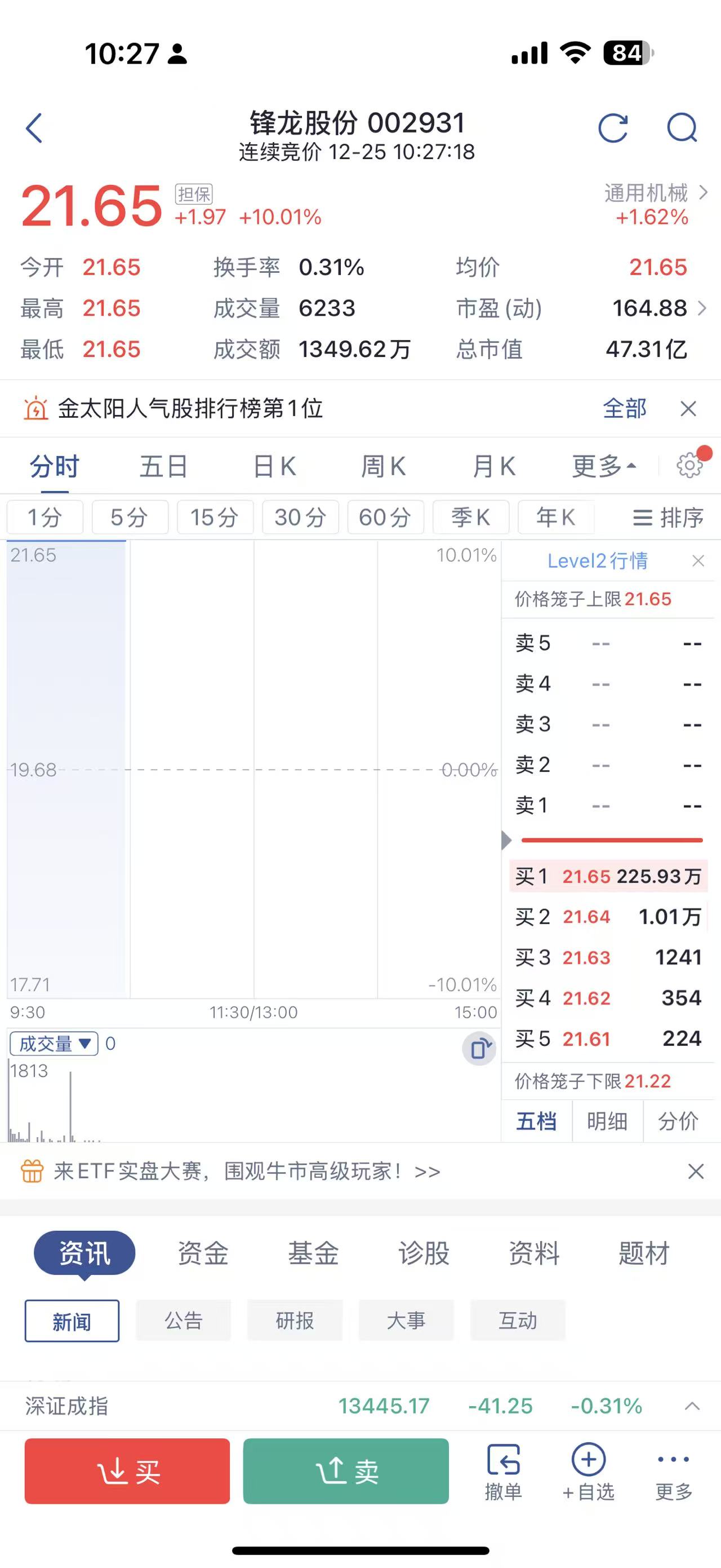 12月25日,鋒龍股份復(fù)牌后一字漲停,報(bào)21.65元/股。截至記者發(fā)稿,漲停板封單量超200萬手。
