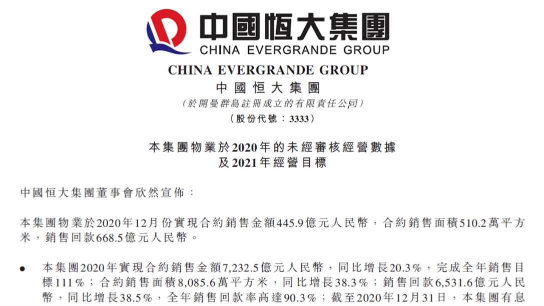 1月5日,中國恒大(3333.HK)發(fā)布公告稱,2020年全年集團實現(xiàn)銷售7232.5億元,同比增長20.3%,完成全年銷售目標111%;銷售面積8085.6萬平方米,同比增長38.3%;銷售回款6531.6億元,同比增長38.5%,全年回款率90.3%。
