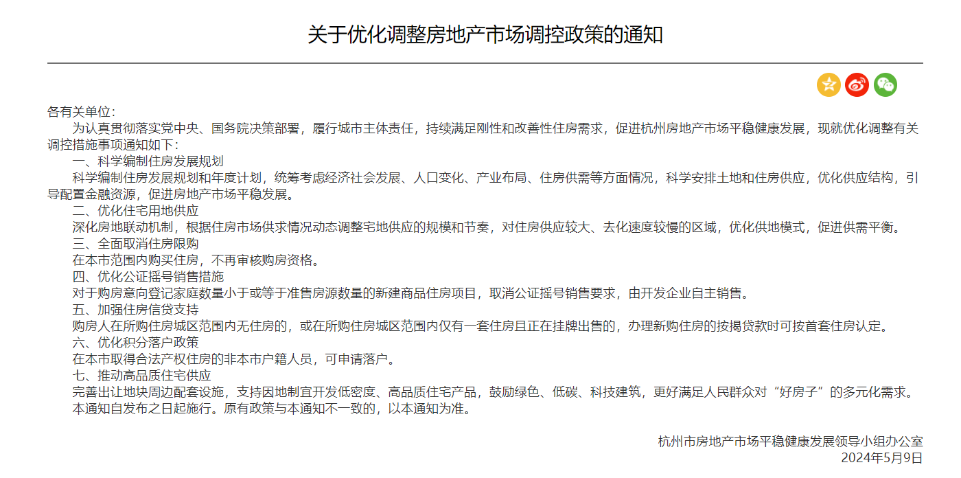5月9日,杭州市房地產(chǎn)市場平穩(wěn)健康發(fā)展領(lǐng)導(dǎo)小組辦公室發(fā)布《關(guān)于優(yōu)化調(diào)整房地產(chǎn)市場調(diào)控政策的通知》(以下簡稱《通知》)。