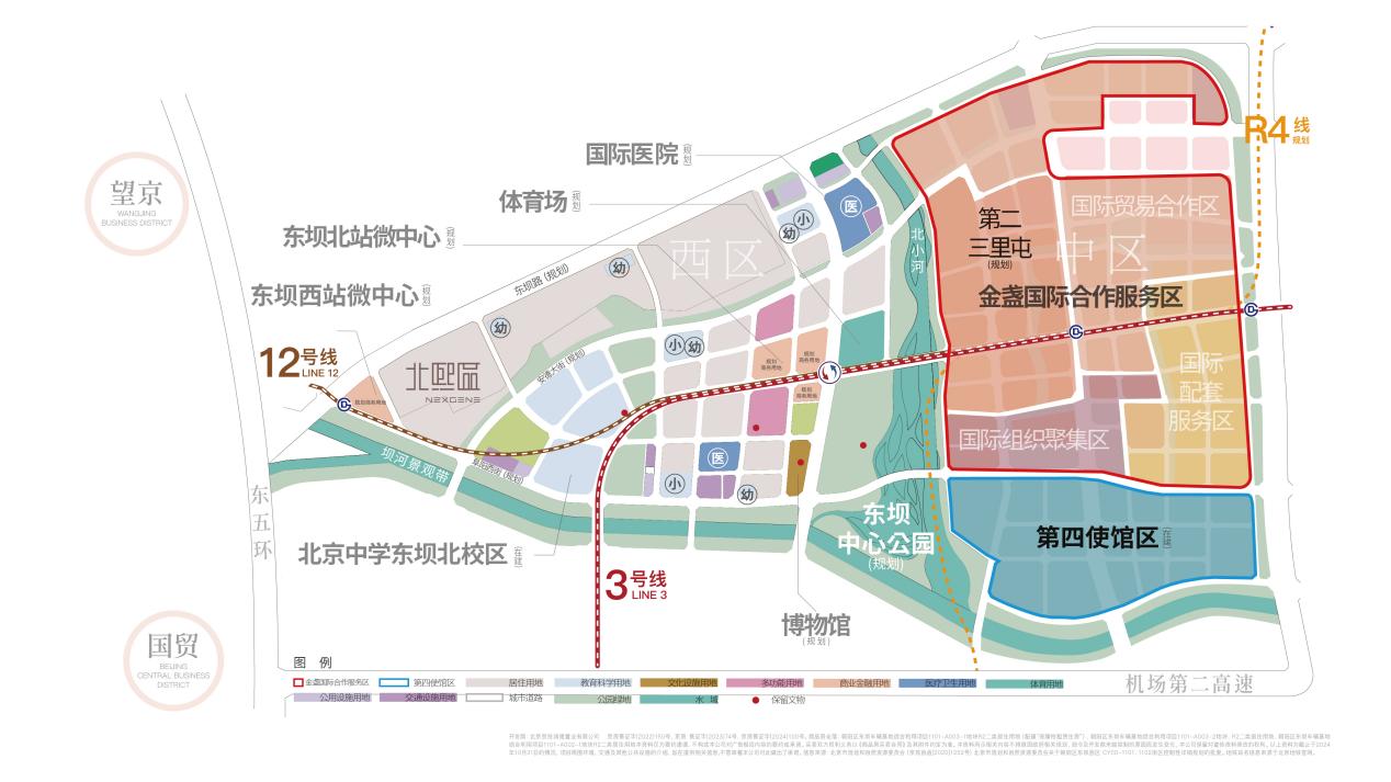 東壩的崛起并非偶然,而是戰(zhàn)略布局與政策扶持共同推動的結(jié)果。自2014年被納入“十二五”時(shí)期十大重點(diǎn)發(fā)展區(qū)域后,東壩便承載起朝陽區(qū)城市功能疏解與升級的重任。2019年,《東壩北西區(qū)域項(xiàng)目控制性詳細(xì)規(guī)劃方案》的通過明確了區(qū)域發(fā)展路徑;2020年,金盞國際合作服務(wù)區(qū)納入自貿(mào)試驗(yàn)區(qū)國際商務(wù)服務(wù)片區(qū),使東壩與國貿(mào)CBD并列為“自貿(mào)雙核”,戰(zhàn)略地位顯著躍升;2023年10月份,《金盞中區(qū)街區(qū)控規(guī)》的正式發(fā)布,標(biāo)志著金盞國際合作服務(wù)區(qū)與第四使館區(qū)的建設(shè)邁入新階段。金盞國際合作服務(wù)區(qū)中區(qū)南部緊鄰第四使館區(qū),定位為“國際交往新主場,生態(tài)宜游新都會”;2024年1月21日,北京市第十六屆人民代表大會的政府工作報(bào)告中明確提出實(shí)施新一輪的三年發(fā)展計(jì)劃,推動第四使館區(qū)建設(shè)。這意味著,三年內(nèi),第四使館區(qū)將具備投入使用的條件。