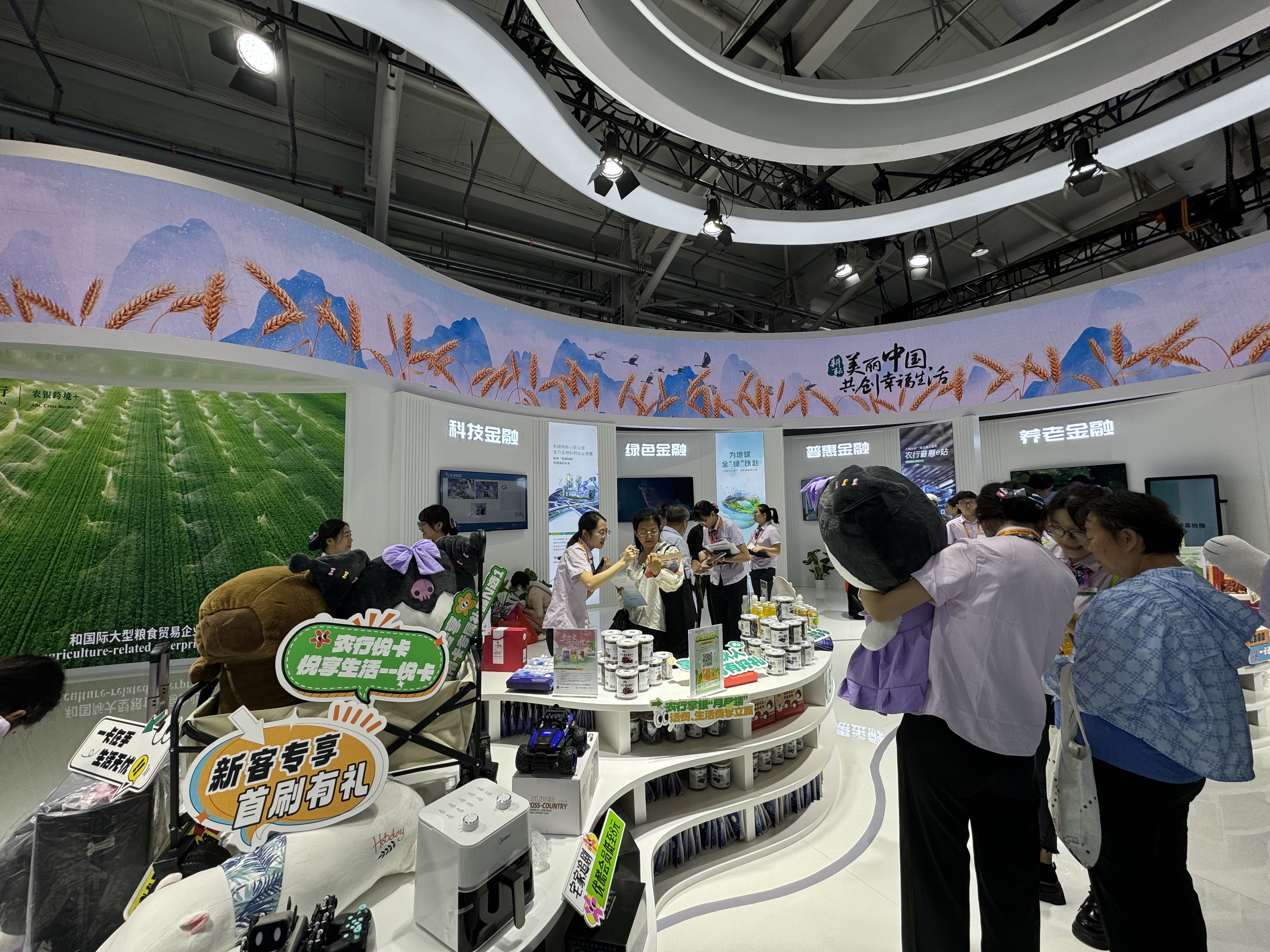 進入農(nóng)業(yè)銀行主展區(qū),猶如走進一幅巨大的山河畫卷。景觀式梯田將觀眾帶入一個充滿包裹感與層次感的峽谷狀空間,展臺中部360度球型屏幕如同緩緩升起的熱氣球,鄉(xiāng)村振興、“五篇大文章”、京津冀協(xié)同發(fā)展十周年等三大板塊依次展開?,F(xiàn)場聚集了不少參觀者,工作人員也積極向他們科普金融知識,辦理相關(guān)業(yè)務。