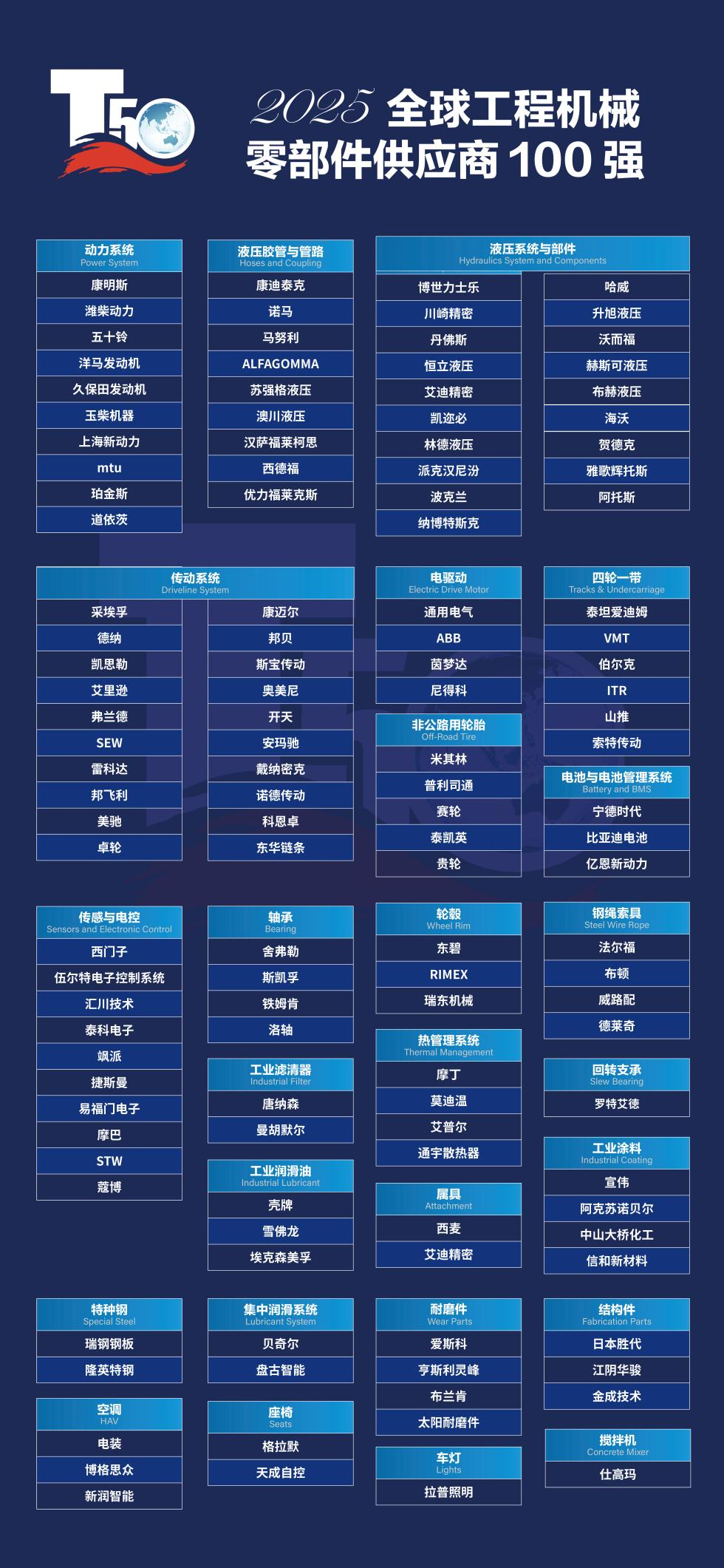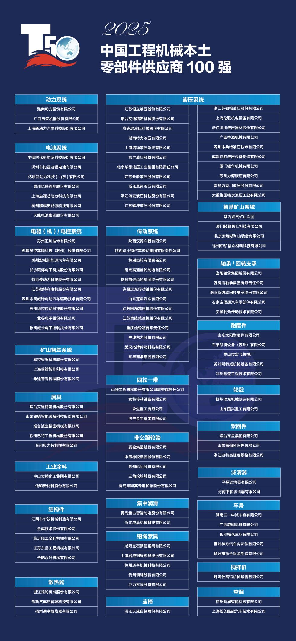 本屆“中國工程機械零部件供應(yīng)商100強”榜單,除覆蓋動力系統(tǒng)、液壓傳動、四輪一帶、屬具、結(jié)構(gòu)件、車身、鋼繩索具、涂料等傳統(tǒng)部件外,還增設(shè)了電池系統(tǒng)、電驅(qū)電控、智慧礦山、礦山智駕等前沿領(lǐng)域,共24種細(xì)分品類。