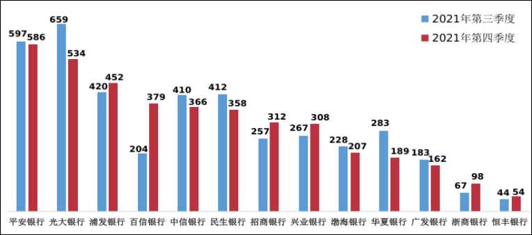 《通報(bào)》顯示,2021年第四季度,銀行業(yè)消費(fèi)投訴較2021年第三季度環(huán)比增長(zhǎng)3.8%。信用卡業(yè)務(wù)和個(gè)人貸款業(yè)務(wù)投訴分別環(huán)比增長(zhǎng)1.3%和3.7%,理財(cái)類業(yè)務(wù)投訴環(huán)比減少4.2%。