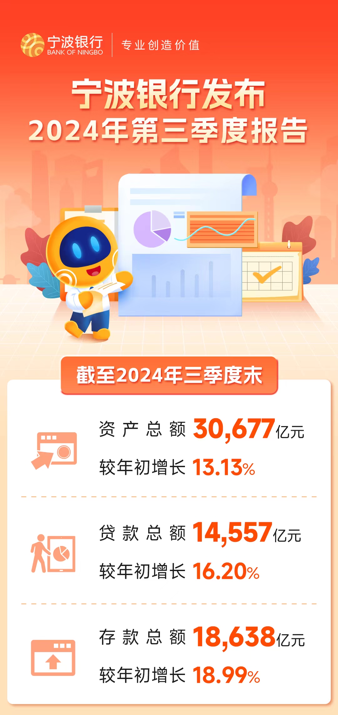 通過“專業(yè)化、數(shù)字化、平臺(tái)化、國(guó)際化”持續(xù)創(chuàng)新經(jīng)營(yíng),2024年前三季度,寧波銀行資產(chǎn)規(guī)模保持穩(wěn)步增長(zhǎng)。三季報(bào)數(shù)據(jù)顯示,截至2024年9月末,寧波銀行資產(chǎn)總額30,676.66億元,較年初增長(zhǎng)13.13%;貸款及墊款總額14,557.05億元,較年初增長(zhǎng)16.20%;存款總額18,637.59億元,較年初增長(zhǎng)18.99%。