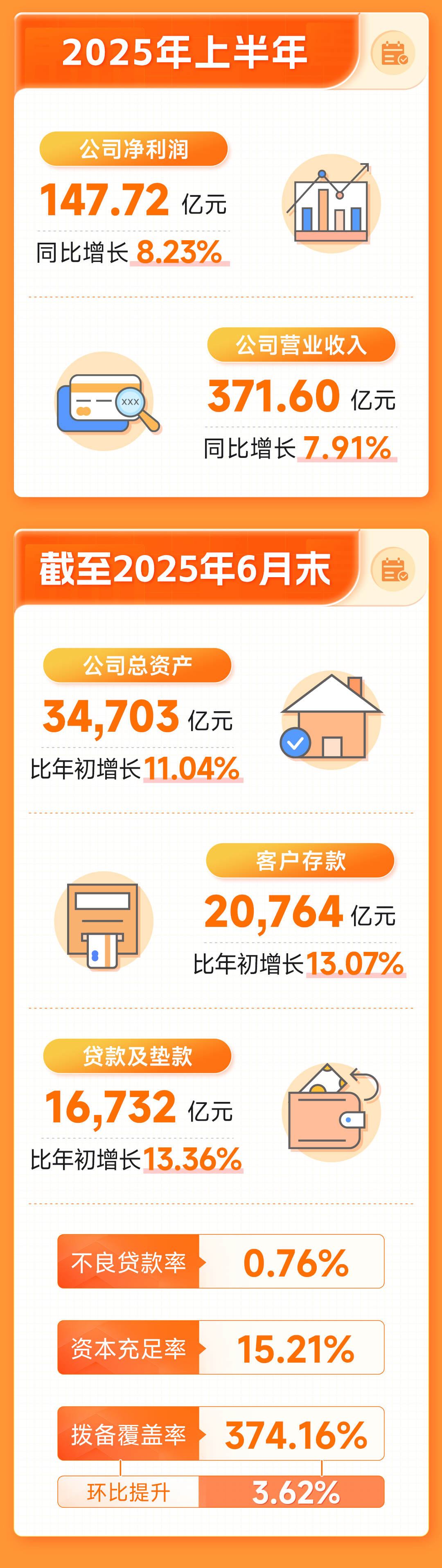 2025年上半年,寧波銀行營業(yè)收入371.60億元,較上年同期增長7.91%;實(shí)現(xiàn)歸屬于母公司股東的凈利潤147.72億元,較上年同期增長8.23%;年化加權(quán)平均凈資產(chǎn)收益率13.80%。