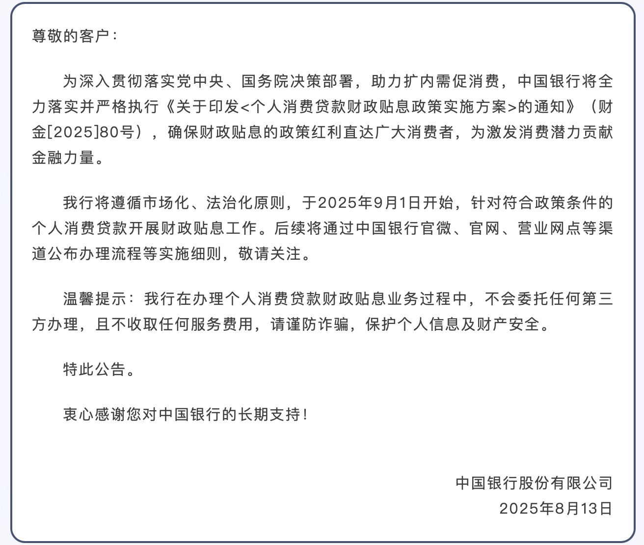 中國銀行公告表示,將遵循市場化、法治化原則,于2025年9月1日開始,針對符合政策條件的個人消費貸款開展財政貼息工作。