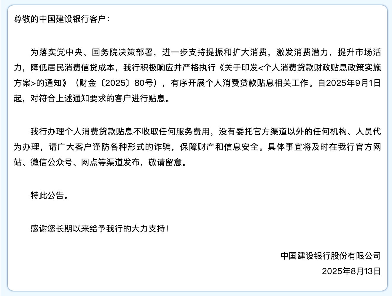 建設(shè)銀行公告提到,為落實黨中央、國務(wù)院決策部署,進一步支持提振和擴大消費,激發(fā)消費潛力,提升市場活力,降低居民消費信貸成本,我行積極響應(yīng)并嚴(yán)格執(zhí)行《實施方案》,有序開展個人消費貸款貼息相關(guān)工作。自2025年9月1日起,對符合上述通知要求的客戶進行貼息。