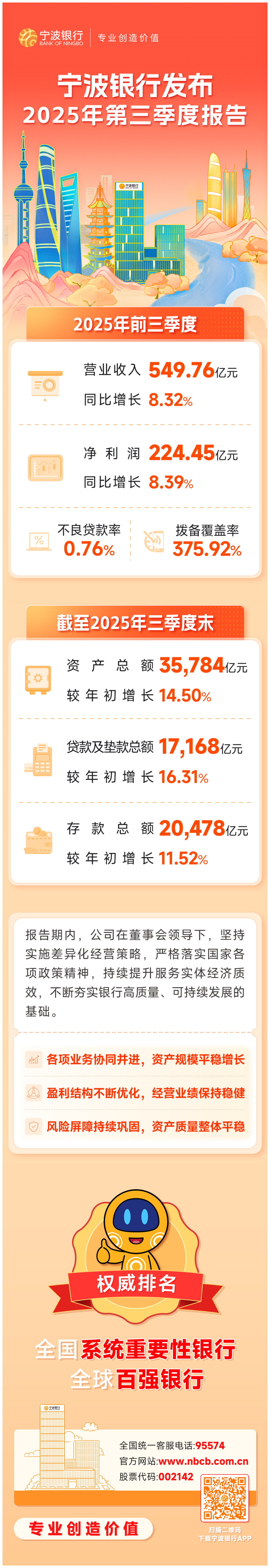 2025年三季度,面對復(fù)雜嚴(yán)峻的內(nèi)外部經(jīng)營環(huán)境,寧波銀行在董事會的領(lǐng)導(dǎo)下,堅持實施差異化經(jīng)營策略,嚴(yán)格落實國家各項政策精神,持續(xù)提升服務(wù)實體經(jīng)濟的質(zhì)效,不斷夯實銀行高質(zhì)量、可持續(xù)發(fā)展的基礎(chǔ)。