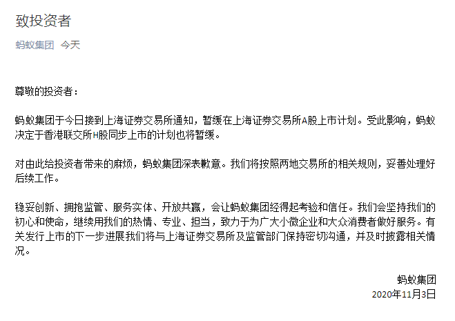 隨后,螞蟻集團(tuán)官方發(fā)致投資者信中稱,螞蟻集團(tuán)于今日接到上海證券交易所通知,暫緩在上海證券交易所A股上市計(jì)劃。受此影響,決定于香港聯(lián)交所H股同步上市的計(jì)劃也將暫緩。對(duì)由此給投資者帶來的麻煩,螞蟻集團(tuán)深表歉意。螞蟻集團(tuán)將按照兩地交易所的相關(guān)規(guī)則,妥善處理好后續(xù)工作。