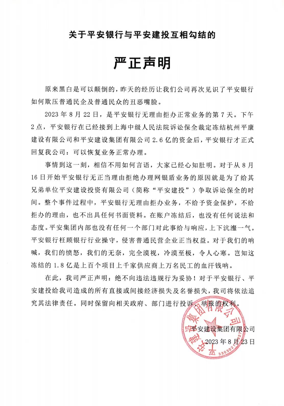 平安建設(shè)在8月23日聲明中稱,2023年8月22日,是平安銀行無(wú)理由拒辦正常業(yè)務(wù)的第7天。下午2點(diǎn),平安銀行在已經(jīng)接到上海中級(jí)人民法院訴訟保全裁定凍結(jié)杭州平康建設(shè)有限公司和平安建設(shè)集團(tuán)有限公司2.6億的資金后,平安銀行才正式回復(fù)該公司:可以恢復(fù)業(yè)務(wù)正常辦理。對(duì)于從8月16日開(kāi)始平安銀行無(wú)正當(dāng)理由拒絕辦理網(wǎng)銀盾業(yè)務(wù)的原因就是為了給其兄弟單位平安建設(shè)投資有限公司(簡(jiǎn)稱“平安建投”)爭(zhēng)取訴訟保全的時(shí)間。整個(gè)事件過(guò)程中,平安銀行無(wú)理由拒辦業(yè)務(wù),不給予資金保護(hù),不給拒辦的理由,也不出具任何書(shū)面資料。在賬戶凍結(jié)后,也沒(méi)有任何說(shuō)法和態(tài)度。