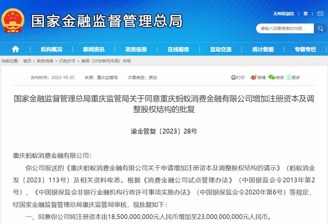 10月25日,根據(jù)國家金融監(jiān)督管理總局官網(wǎng),經(jīng)國家金融監(jiān)督管理總局重慶監(jiān)管局審核批復(fù),同意重慶螞蟻消費(fèi)金融有限公司(下稱:螞蟻消金)將注冊資本由185億元人民幣增加至230億元人民幣。此次增加注冊資本并調(diào)整股權(quán)結(jié)構(gòu)后,螞蟻消金股東達(dá)13家。