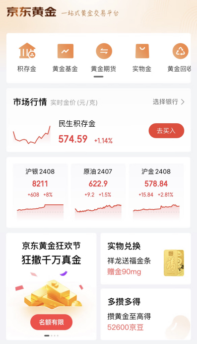 為滿足多元化黃金投資者訴求,京東金融推出了“京東黃金”頻道,是涵蓋積存金(可兌換實(shí)物)、黃金ETF聯(lián)接基金、黃金股基金以及黃金回收等多種投資工具的一站式黃金投資理財平臺,吸引了大量用戶關(guān)注和參與。其中,京東金融的積存金服務(wù)憑借5x24小時交易、T+0模式和日日生息等差異化特性,得到了大量用戶的青睞。