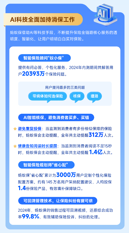 據(jù)介紹,2024年螞蟻保的“AI自助解讀”共為221萬用戶提供了理賠結(jié)論解讀,用戶疑問自助解決率96%;“真人協(xié)賠專家”則為理賠糾紛用戶提供理賠協(xié)助服務(wù),2024年服務(wù)9.4萬名用戶,協(xié)賠化解率達(dá)99%。