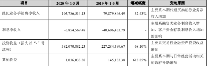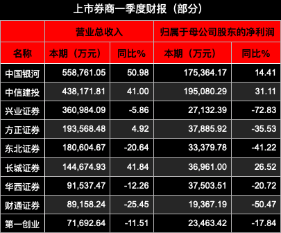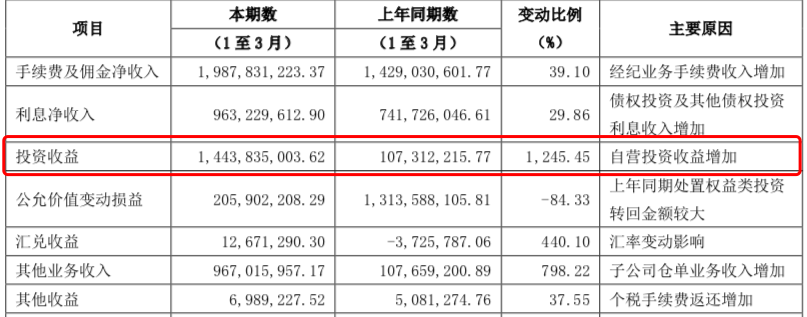 中國銀河一季度實現(xiàn)營業(yè)收入55.88億元,同比增長50.98%;實現(xiàn)歸屬于上市公司股東的凈利潤17.54億元,同比增長14.41%。其中,中國銀河的投資收益同比大增1245.45%,主要因為自營投資收益增加。