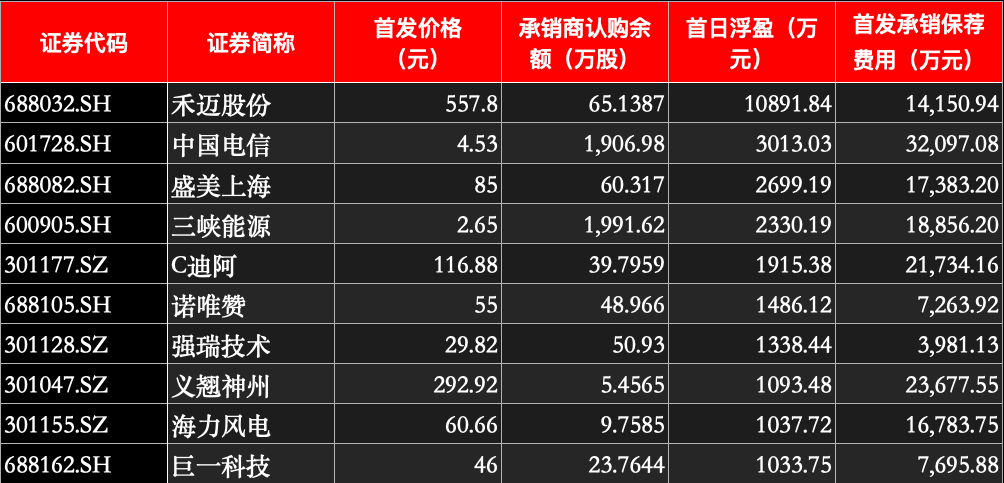 一直以來,大部分主承銷商在新股包銷方面的收入非??捎^,部分甚至接近了承銷保薦的費用。在禾邁股份的此次發(fā)行中,其承銷及保薦費為1.42億元。而今年以來券商包銷首日浮盈超1000萬元的僅有10家,破億元的僅有1家。